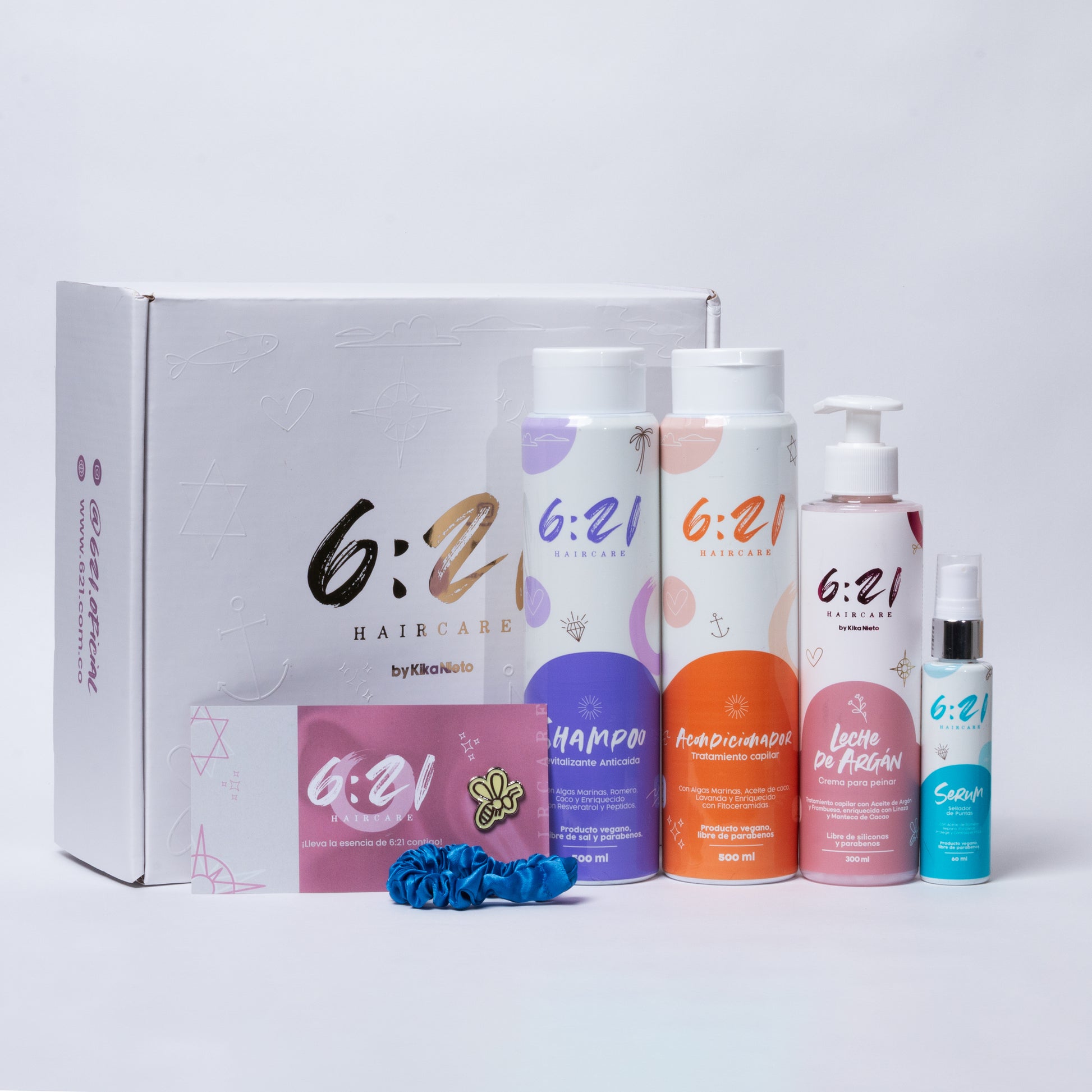 Shampoo anticaída 6:21, Acondicionador hidratante, Leche de argán para hidratación intensa, Serum reparador. Accesorios exclusivos, Caja decorativa con diseño festivo y una tarjeta con un pin de la marca.
